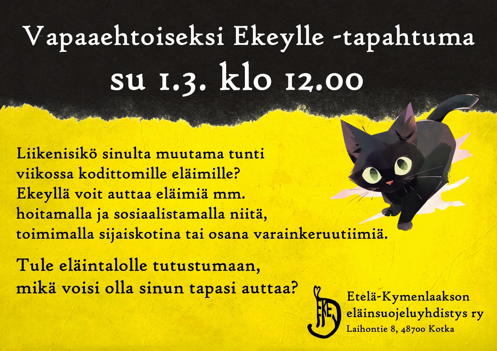 Meitä eläinten auttajia tarvitaan lisää! Tule sunnuntaina 1.3. klo 12 Ekeyn eläintalolle osoitteeseen Laihontie 8 katsomaan, mikä olisi sinulle sopiva tapa auttaa.
